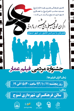 07 دی 1393 3 hamed 12,002 اکران عمومی جشنواره مردمی فیلم عمار 1393 اکران عمومی جشنواره فیلم مردمی عمار توسط کانون فرهنگی هنری بقیه الله (عج) با همکاری شهرداری تسوج پنج شنبه 11 دی ساعت 15:30 الی 19 سالن فرهنگسرای شهرداری تسوج تگ ها